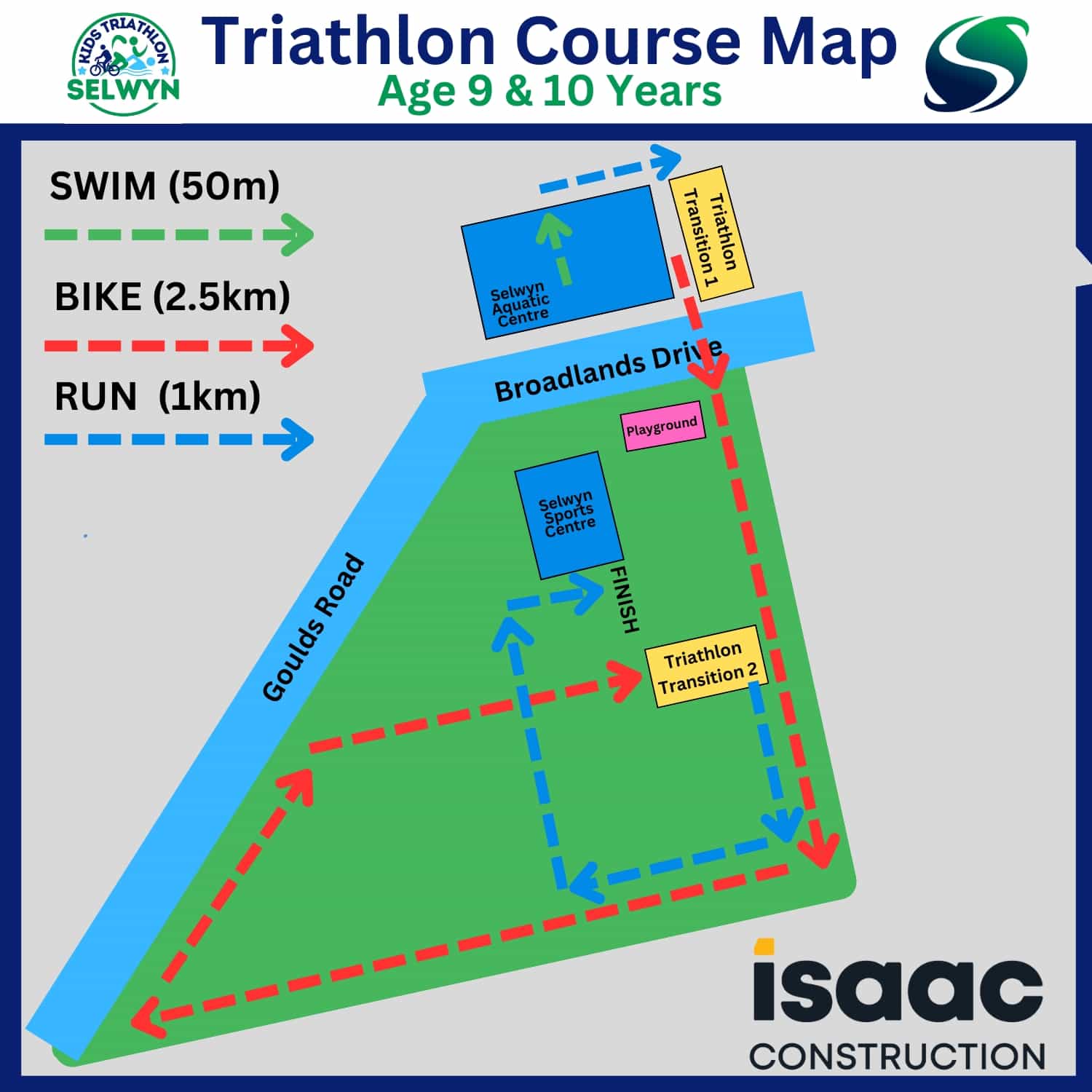The Isaac Construction Selwyn Kids Triathlon follows the traditional swim, bike, run format of triathlon. The event is specifically designed for primary school aged children and structured to give them an introductory experience to the sport through a fun, positive and encouraging atmosphere.