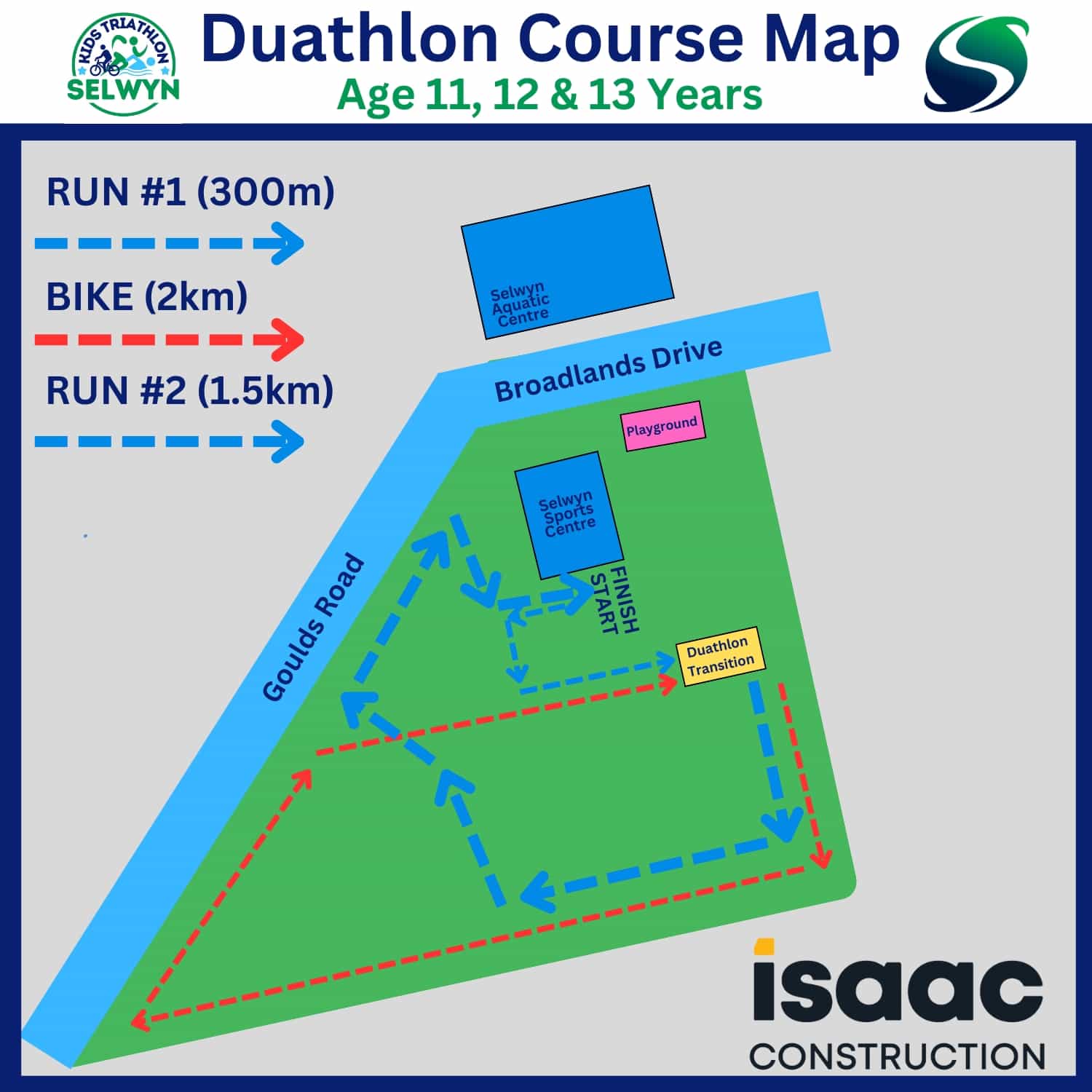 The event is run out of the Selwyn Aquatic Centre and Foster Park in Rolleston. The participants will swim in the pool complex and upon exiting the pool, grab their bikes, push them across Broadlands Drive and begin the bike course. Within the confines of Foster Park they will complete the bike and run components of the race before finishing the event.